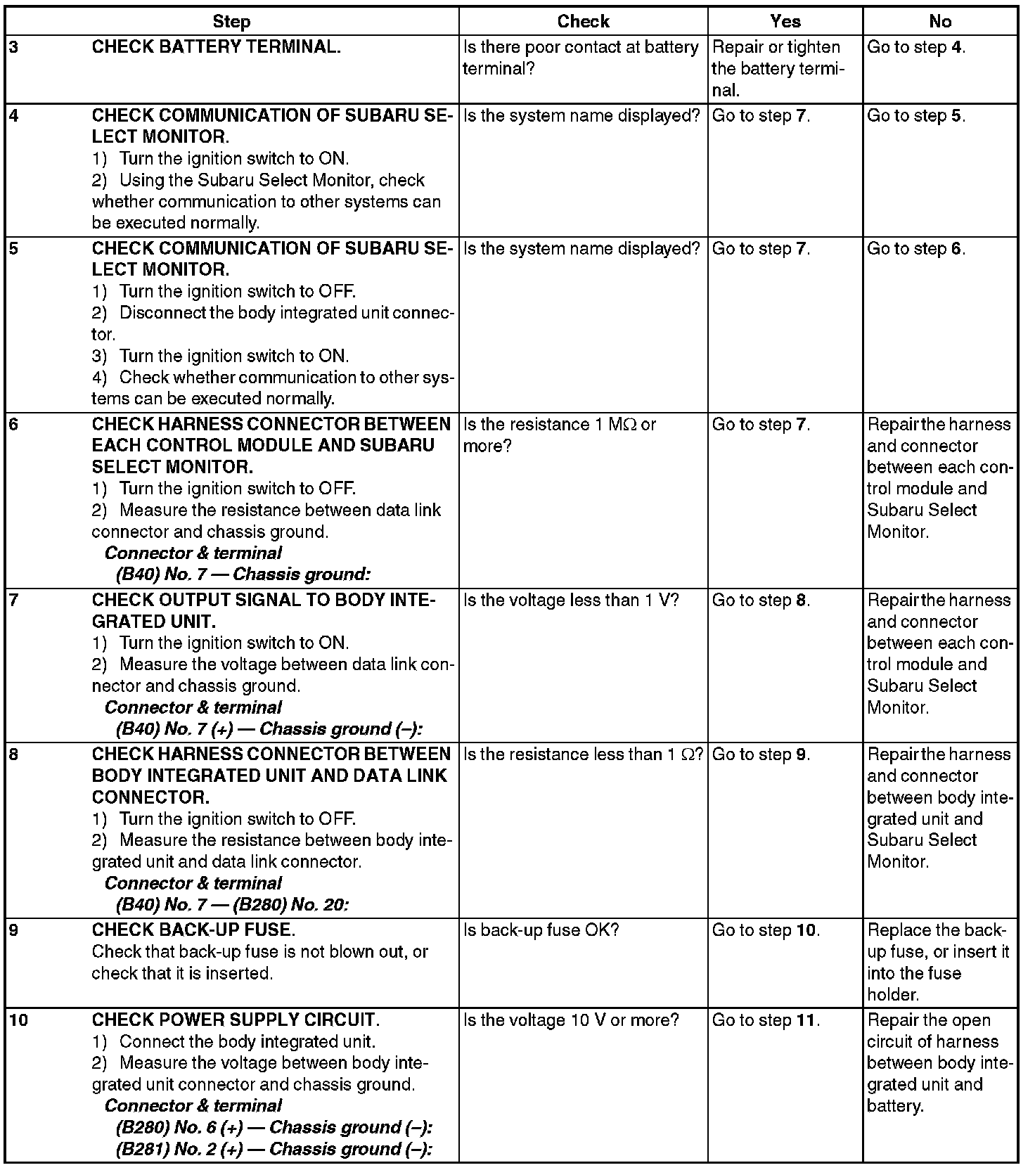 In order to check the body integrated unit function, inspect the body integrated unit and actuator using Subaru Select Monitor without operating switches.