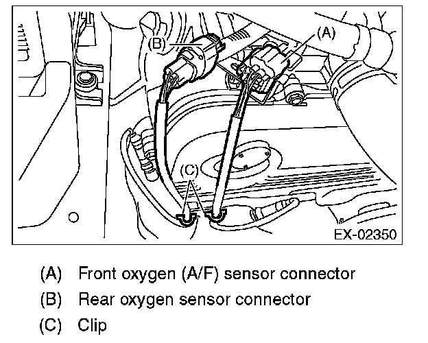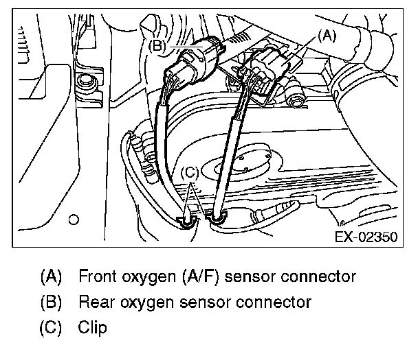 3. Disconnect the rear oxygen sensor connector, and remove the clip holding the rear oxygen sensor harness.