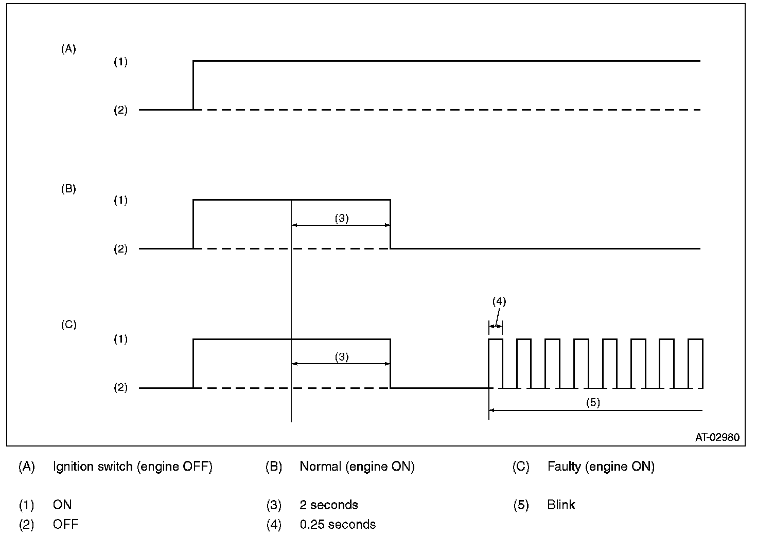 When any on-board diagnostics item is malfunctioning, the AT OIL TEMP light blinks. The light keeps blinking from when the malfunction is detected after starting the engine, until the ignition switch is turned OFF. The faulty parts or unit can be identified by reading DTCs. Problems which occurred previously can also be identified through the memory function. If the AT OIL TEMP light does not blink although a problem is occurring, the problem can be determined by checking the performance characteristics of each sensor using the Subaru Select Monitor. Indicator light signal patterns are as shown in the figure.