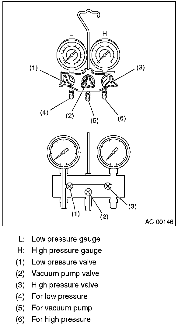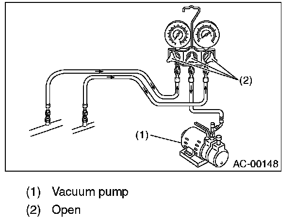 4. Operate the vacuum pump and open the low pressure and high pressure side valves. Next, open the center manifold hose valve, and begin evacuation.