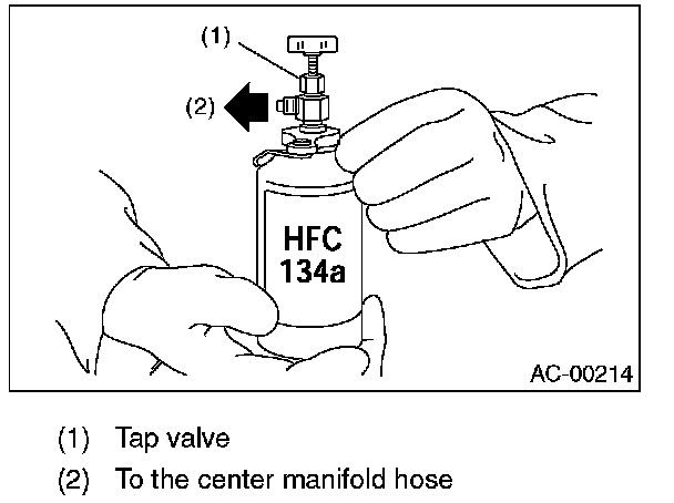 18. If the HFC-134a supply container becomes empty, close all valves, and close the can tap valve to replace the empty container. After replacing with a new HFC-134a supply container, perform air purge, and resume the filling operation.