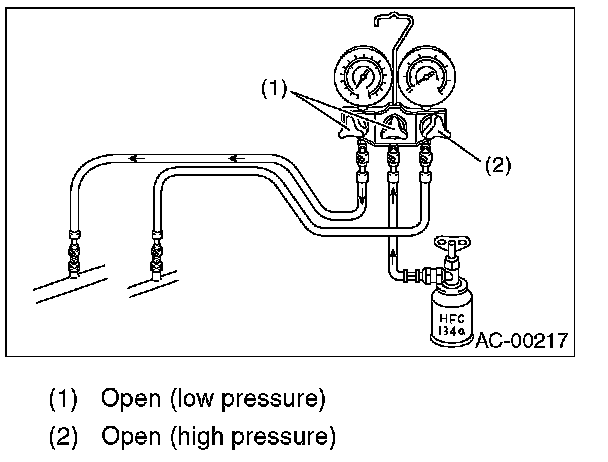 CAUTION: When filling with the engine running, do not open the high pressure side valve. Always fill from the low pressure side.