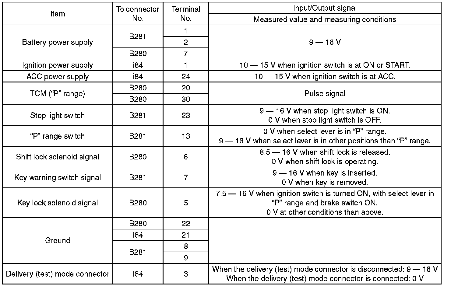 Pinout Values and Diagnostic Parameters
