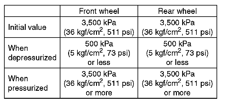 7) Read values indicated on the pressure gauge and check if the fluctuation of the values between decompression and compression meets specification. Depress the brake pedal and check that it is not abnormally hard, and tightness is normal.