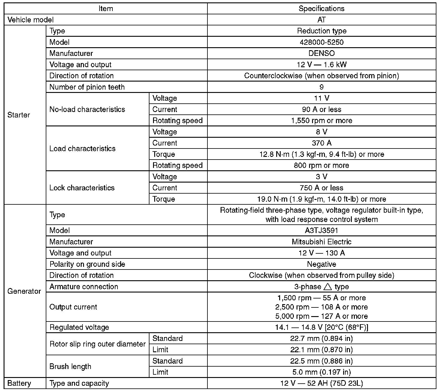Starting and Charging: Specifications
