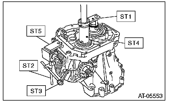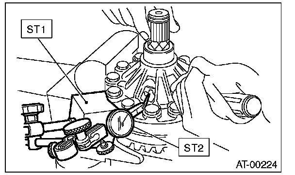 9) Turn the drive pinion a few times with ST1 and check to see if the backlash is within the specified value, using ST2, ST3, ST4 and ST5.
