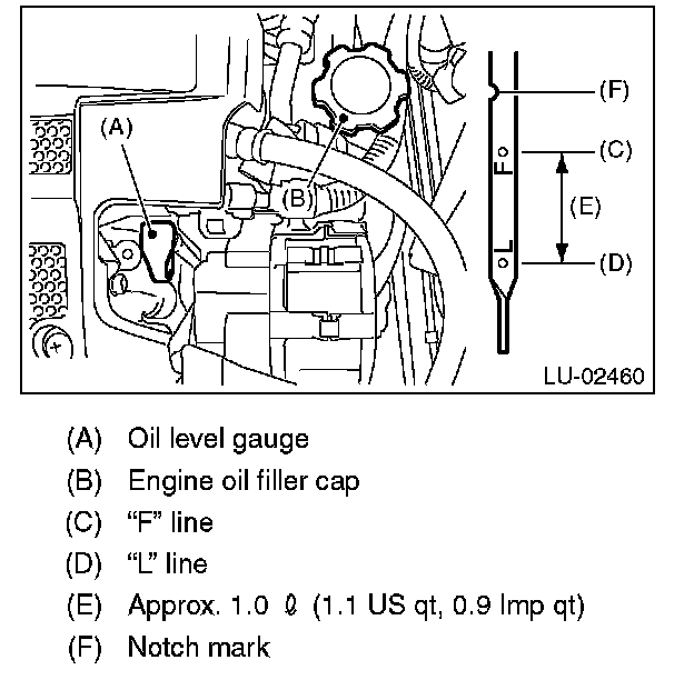 9) After stopping the engine, recheck the oil level. If necessary, add engine oil up to the "F" line on oil level gauge.