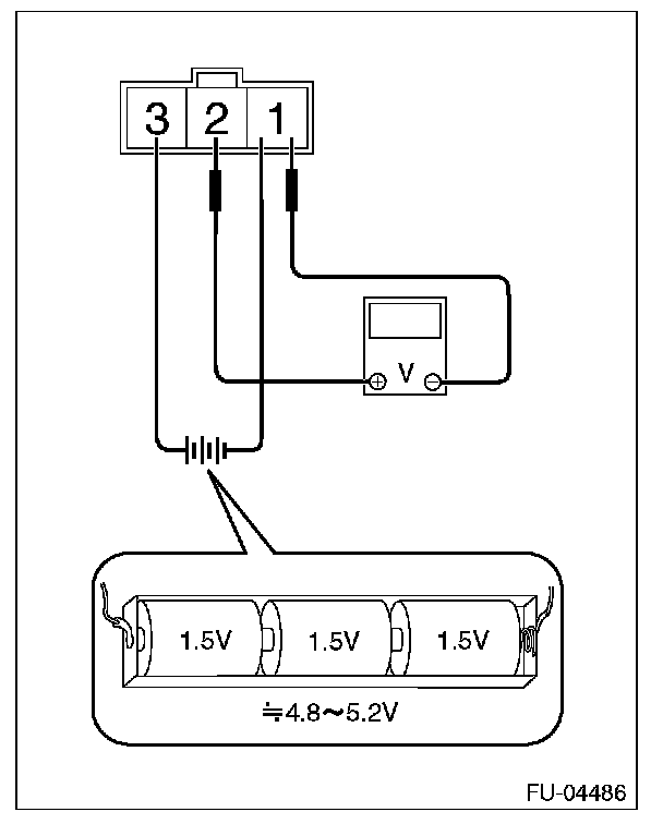 2. Connect dry-cell battery positive terminal to terminal No. 3 and dry-cell battery ground terminal to terminal No. 1, circuit tester positive terminal to terminal No. 2 and the circuit tester negative terminal to terminal No. 1.