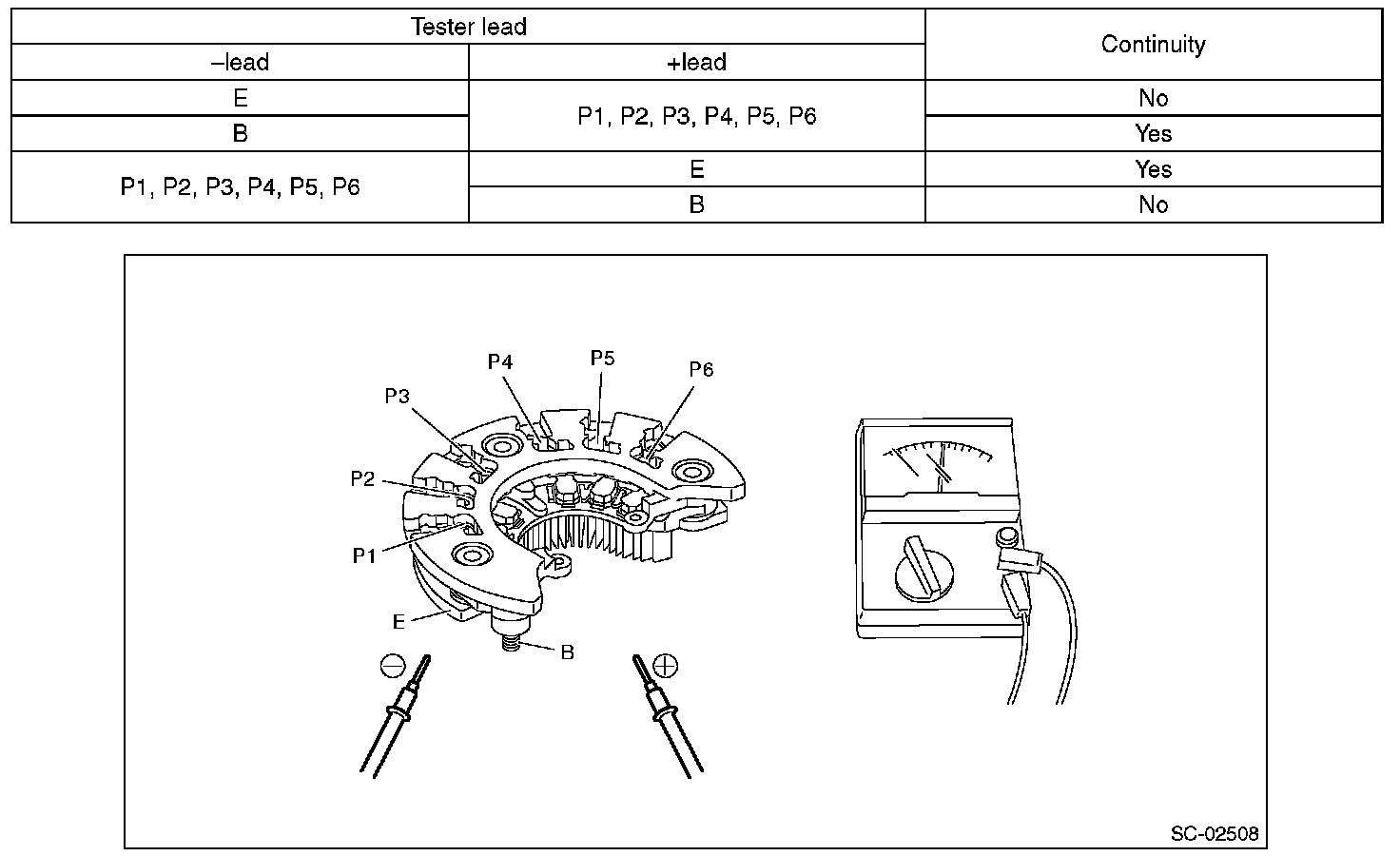 1. Check for continuity between the diode lead and terminal E or B. If continuity is not as shown in the table, replace the rectifier.
