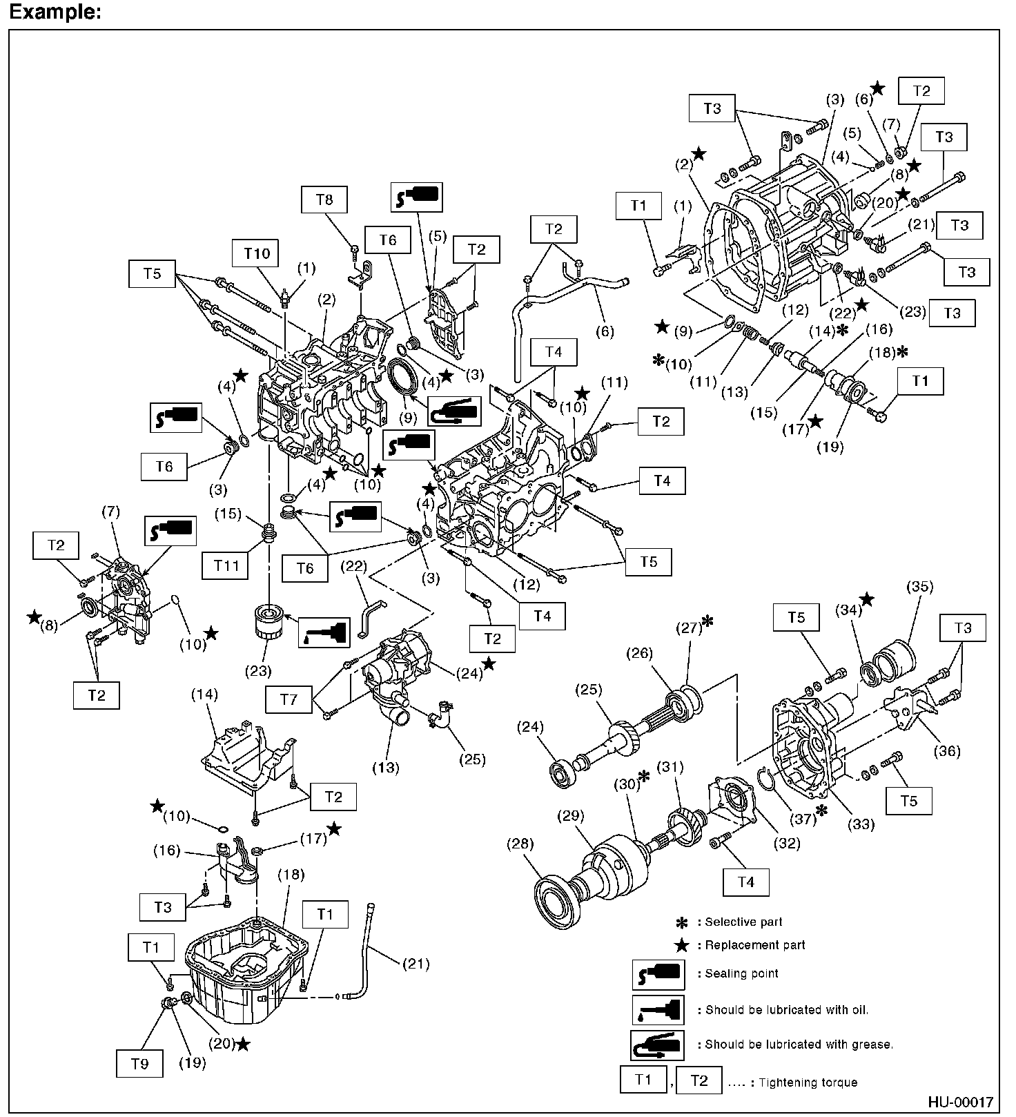 Illustrations are provided for each component. The information necessary for repair work (tightening torque, grease up points, etc.) is described on these illustrations. Information is described using symbol. To order parts, refer to parts catalogue.