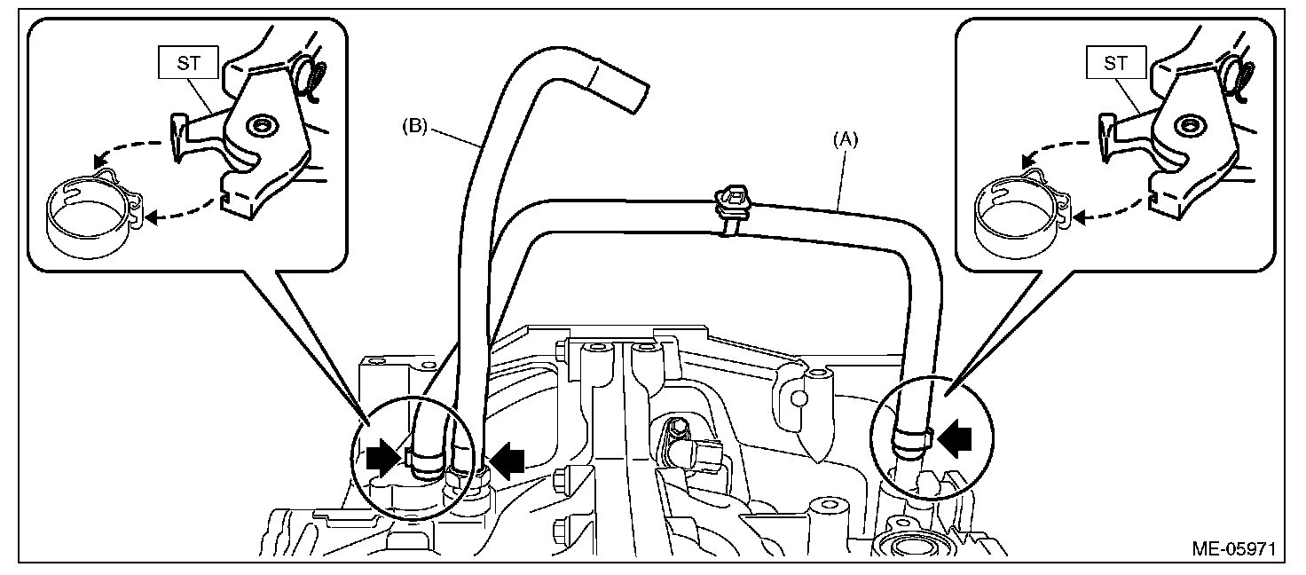 Pinch the clamp of the PCV hose assembly (A) by fitting the cut out in the ST with the protrusion on the clamp as shown in the figure, and unlock the clamp.