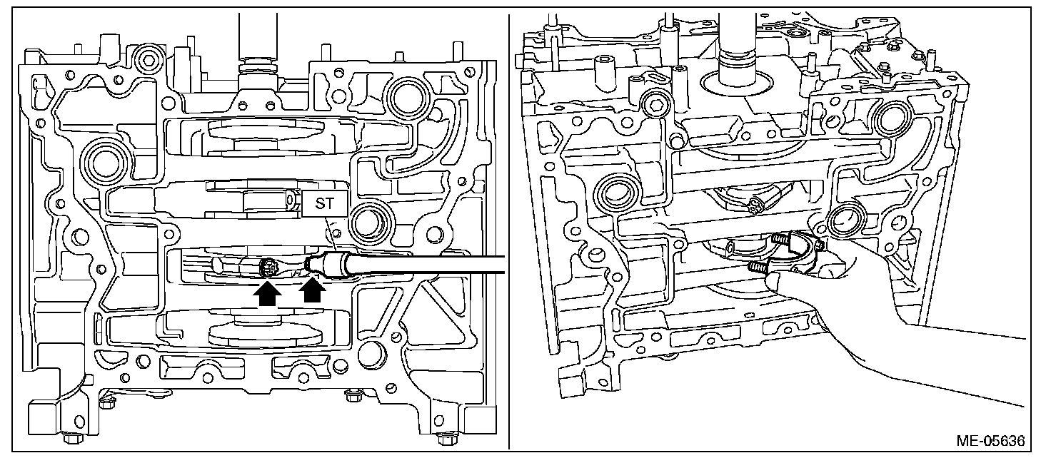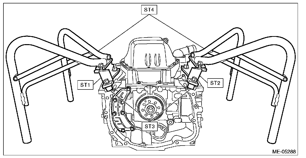 19) Set the cylinder block so that the oil pan is on the upper side, remove the ST1, ST2, ST3 and ST4 from cylinder block and oil pan upper.