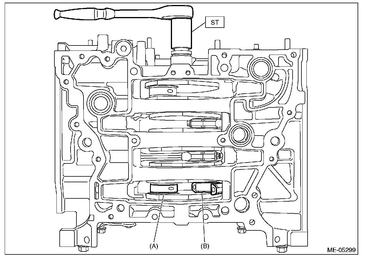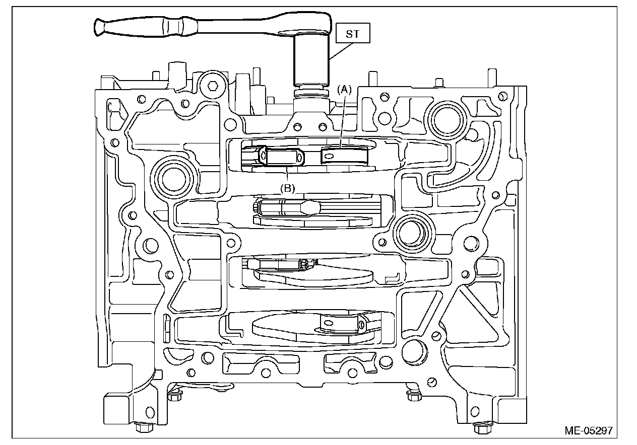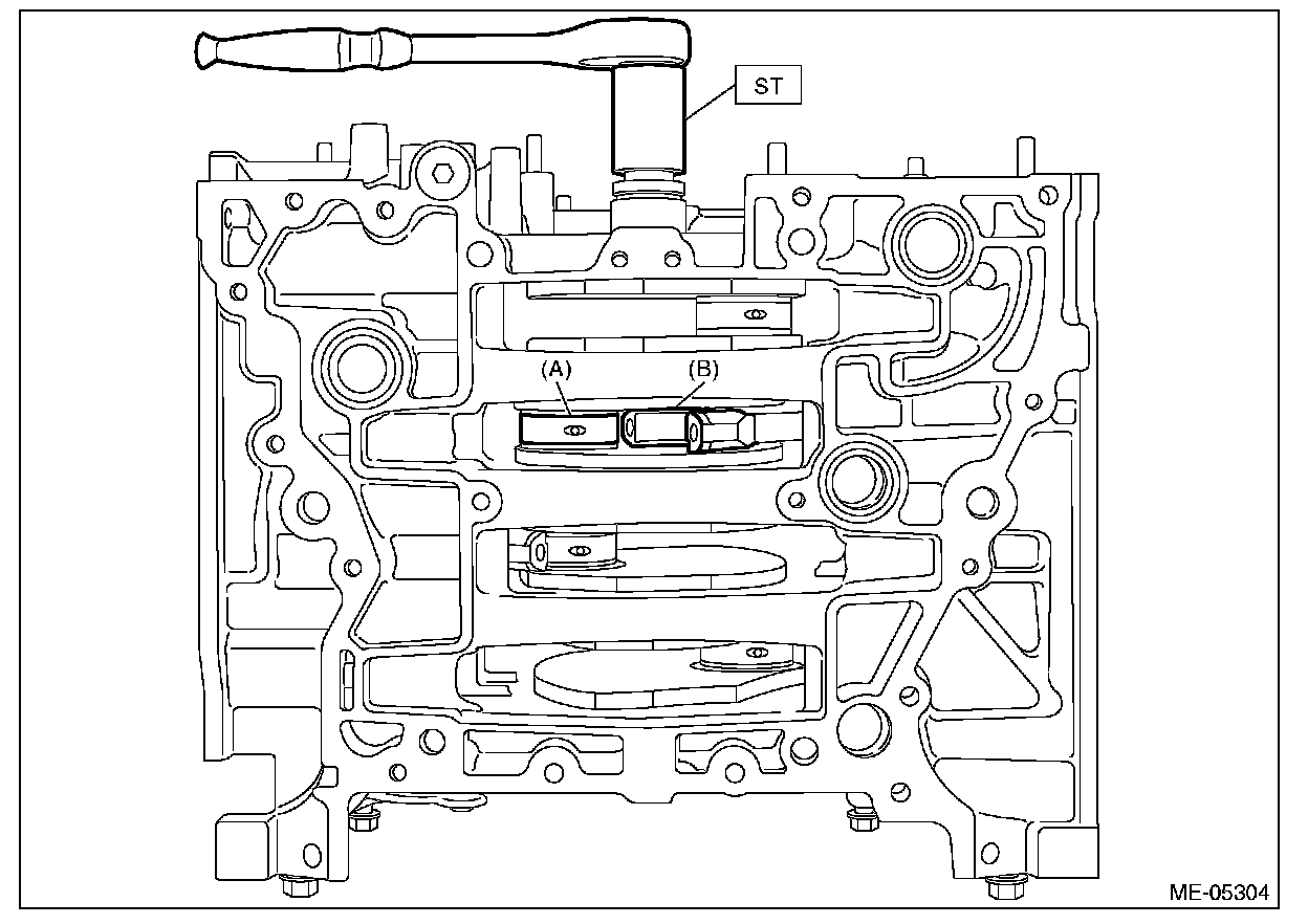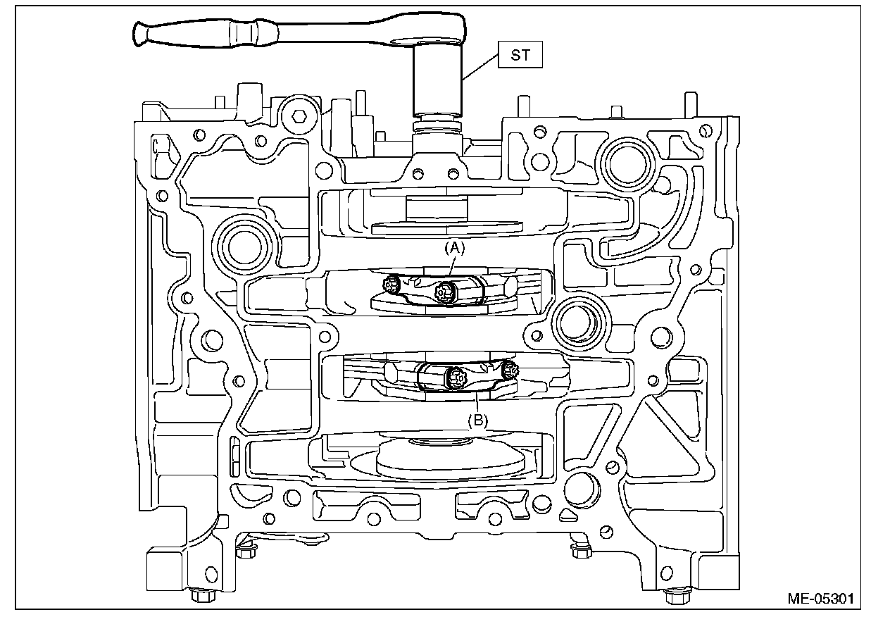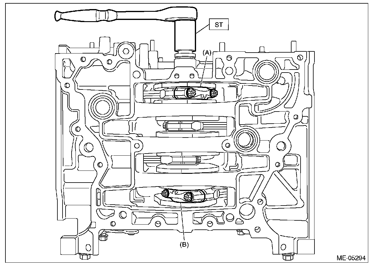 (1) Turn the crankshaft so that the #1 connecting rod cap (A) and #4 connecting rod cap (B) is located at the position shown in the figure using ST.