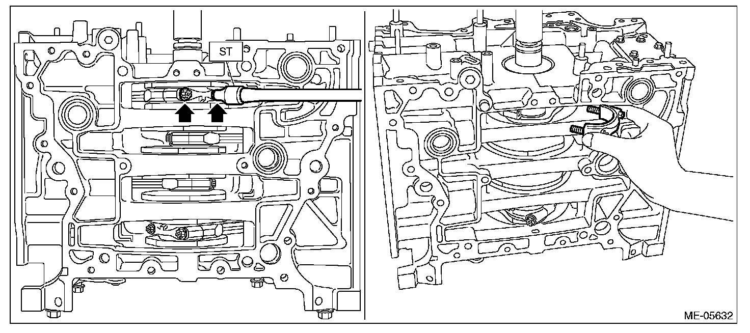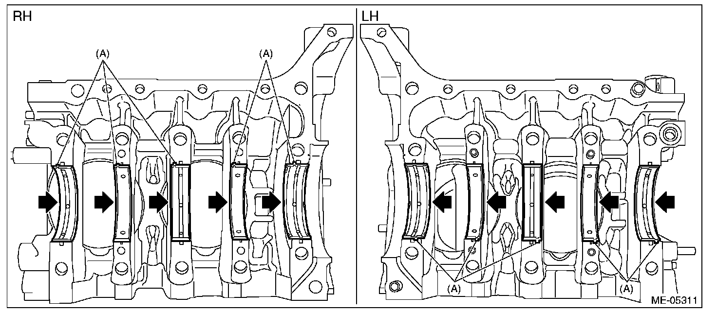 Lift the cylinder block RH slightly, and confirm that the crankshaft is remaining in the cylinder block LH. If the cylinder block RH is lifted carelessly when separating, the crankshaft may stick to cylinder block RH, then fall off.