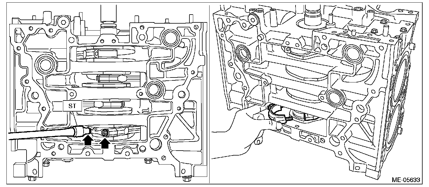 (2) Using ST, loosen the #2 connecting rod cap bolt, and remove the #2 connecting rod cap bolt and #2 connecting rod cap.