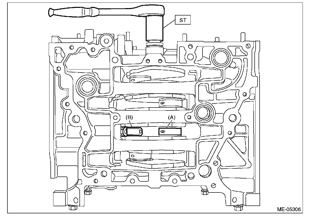 (1) Turn the crankshaft so that the #2 connecting rod cap (A) and #3 connecting rod cap (B) is located at the position shown in the figure using ST.