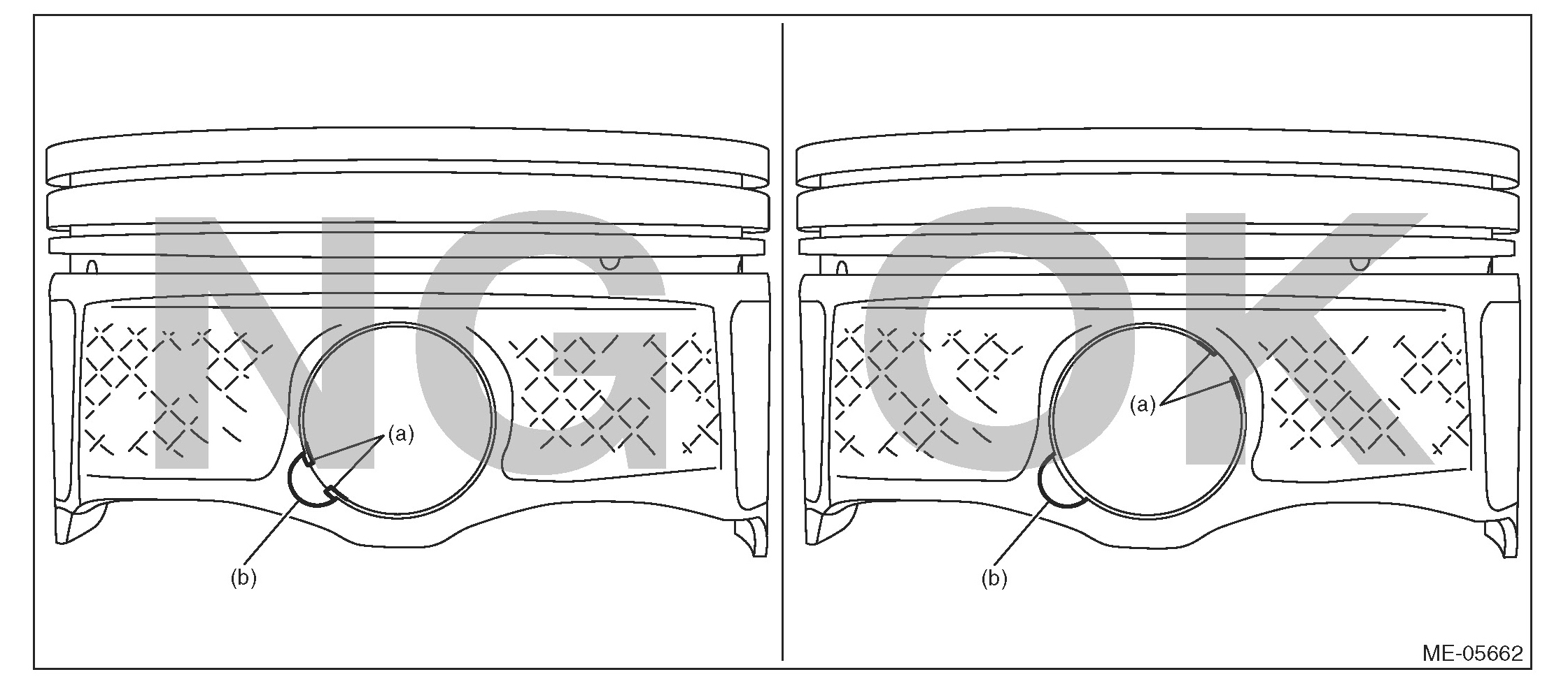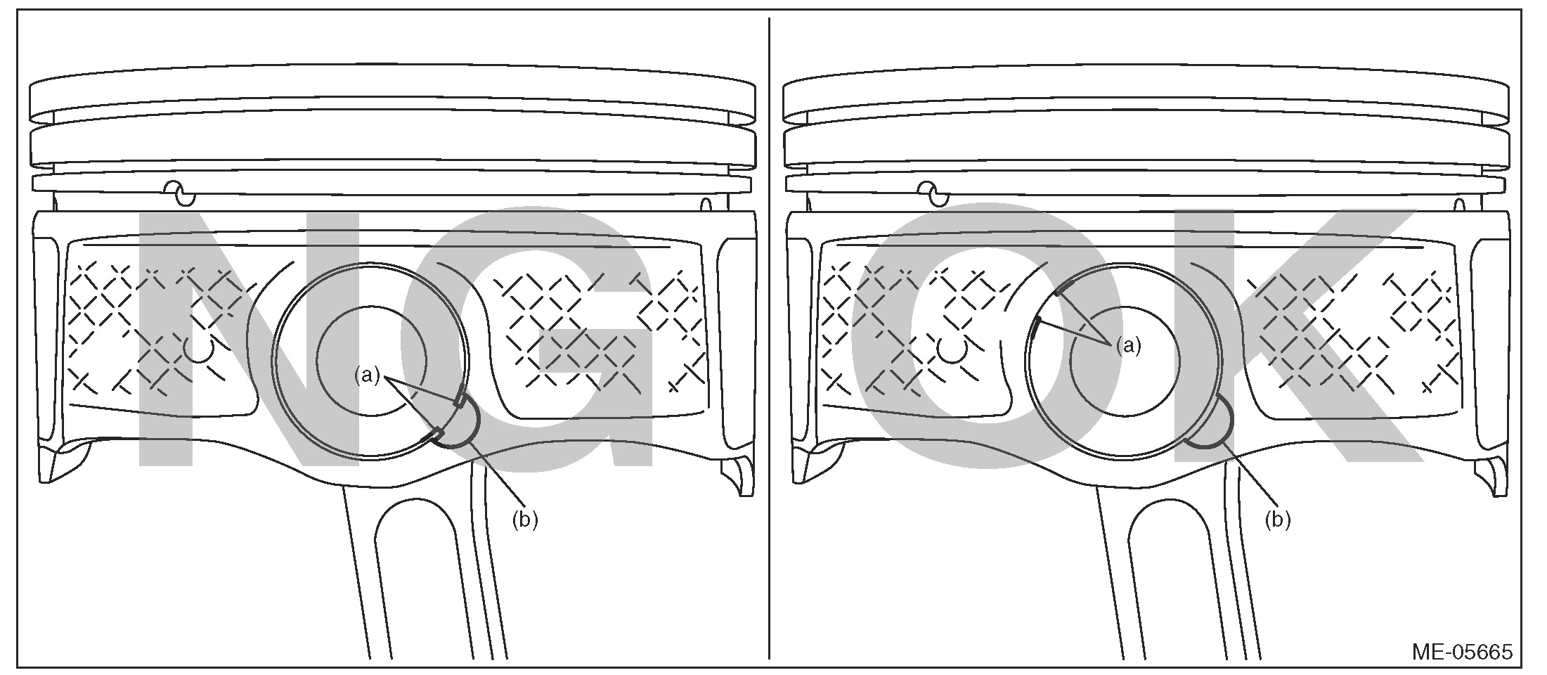 ^ After installing the circlip, rotate the circlip so that its end part (a) and the cutout portion of circlip groove (b) do not match.