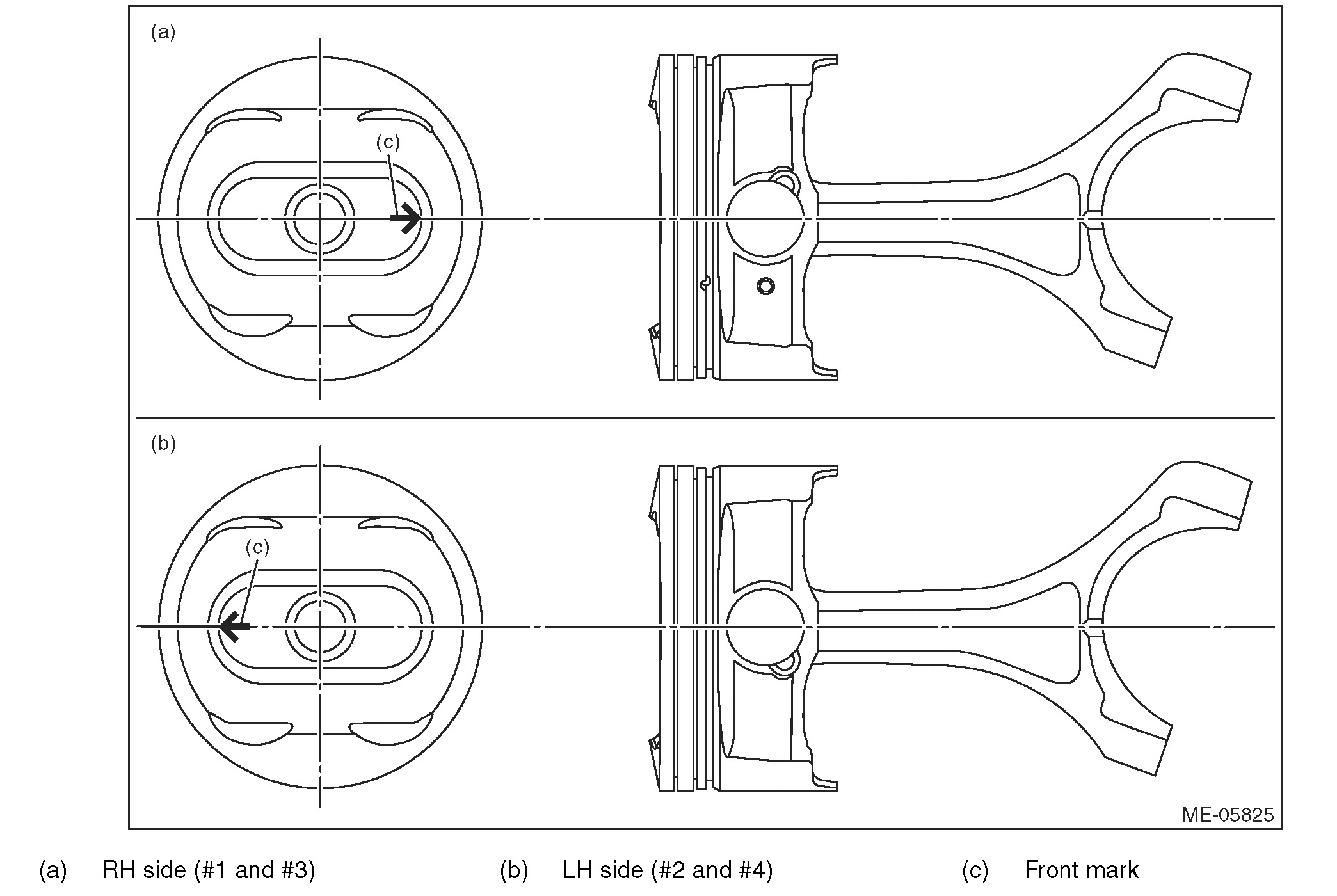 Align the front mark of piston and the connecting rod direction correctly as shown in the figure.
