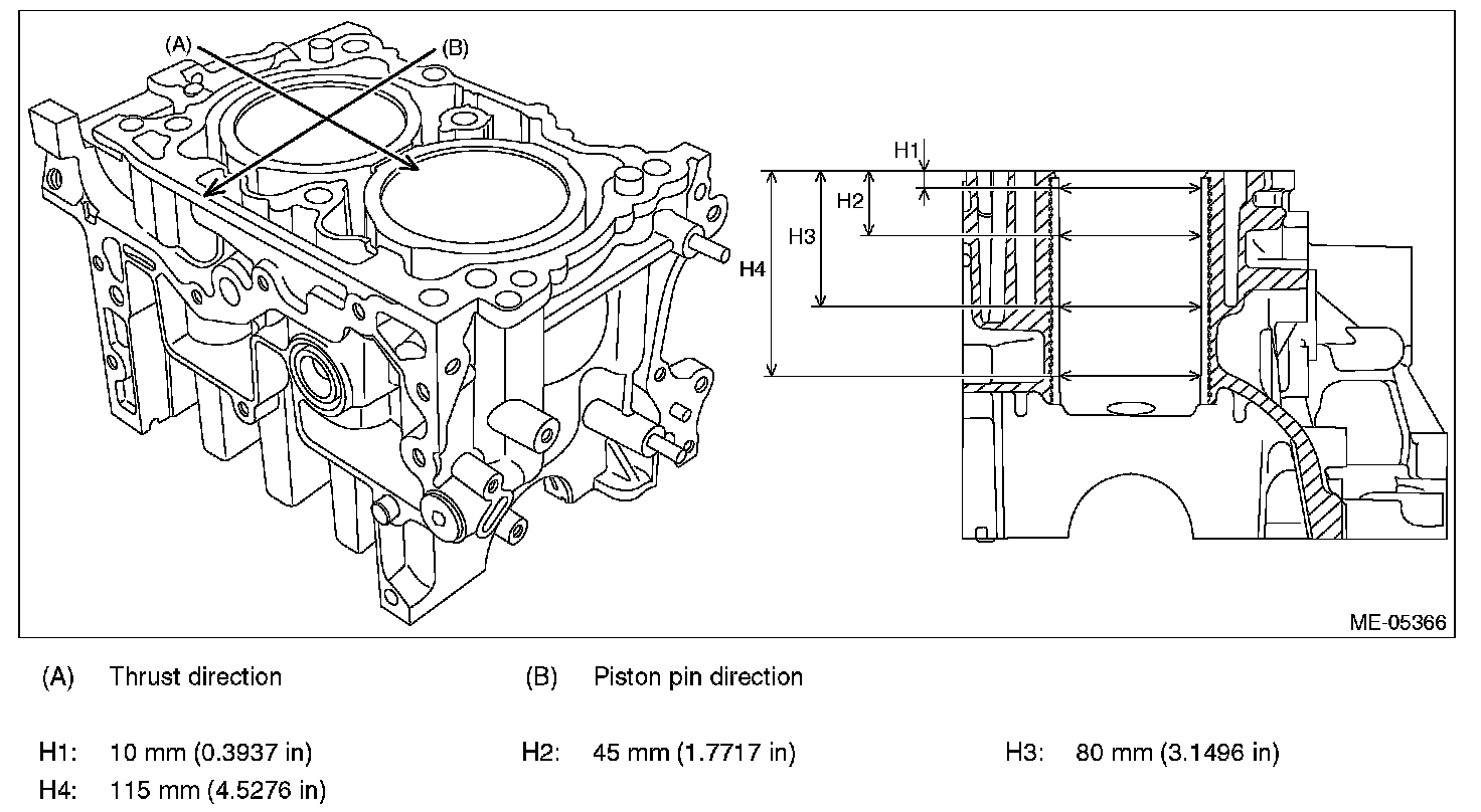^ Measure the inner diameter of each cylinder liner in both the thrust and piston pin directions at the heights as shown in the figure.