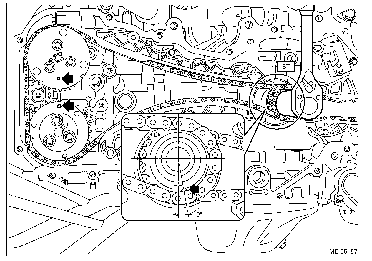 8) Using ST and by turning the intake cam sprocket LH approximately 180°, align the alignment marks of intake cam sprocket LH to the positions (zero-lift position) as shown in the figure.