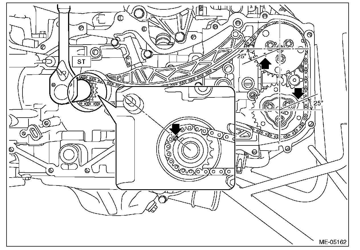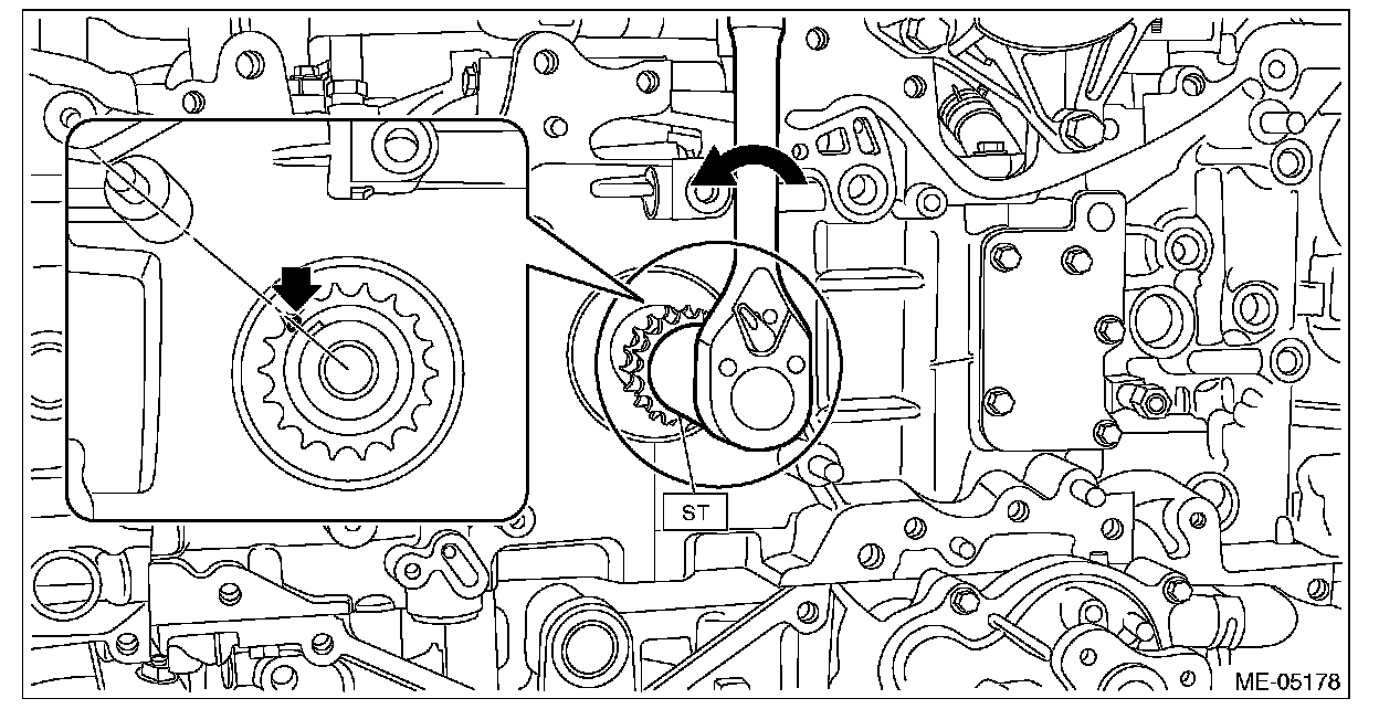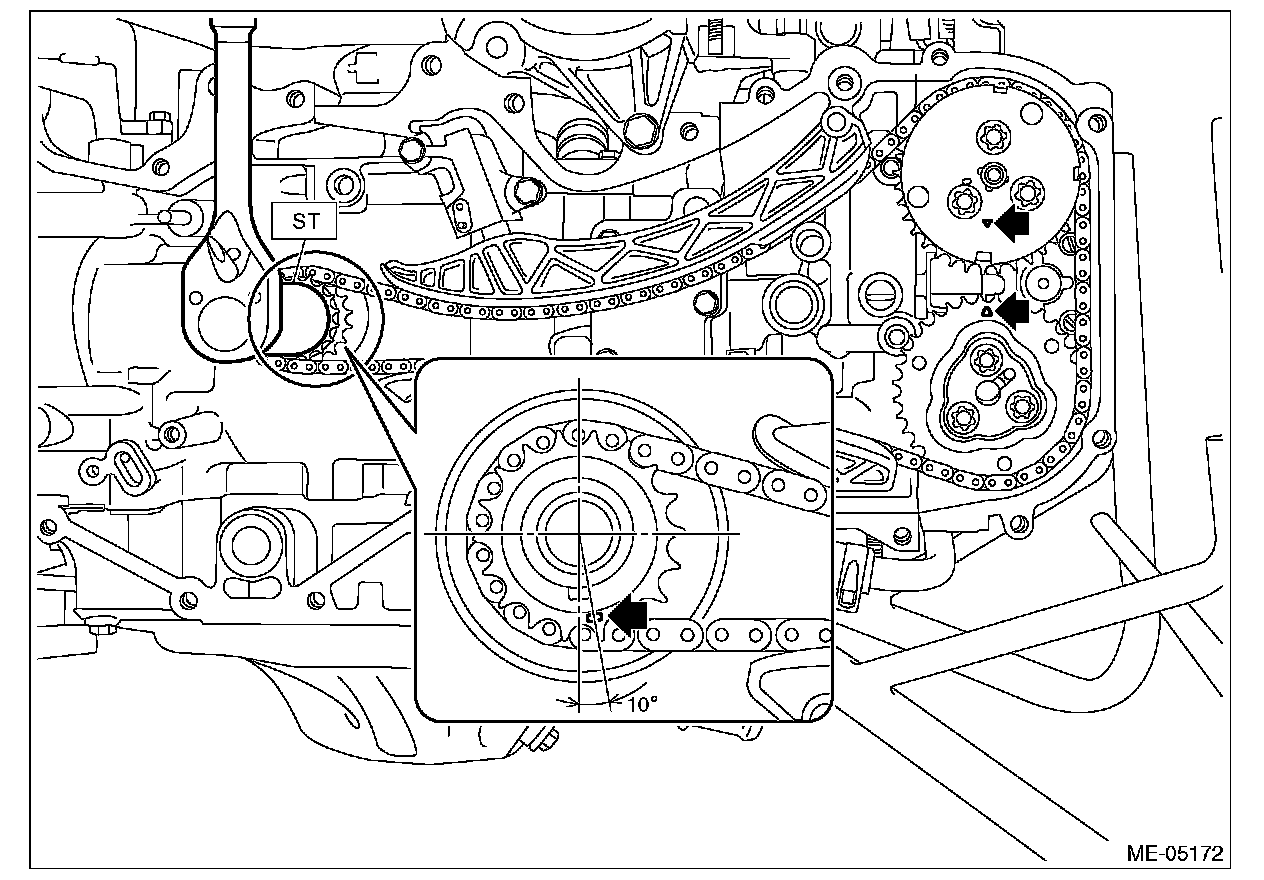 2) Check that the crank sprocket is located at the position sown in the figure. If not aligned, using ST turn the crankshaft to align the crank sprocket alignment mark to the position shown in the figure.