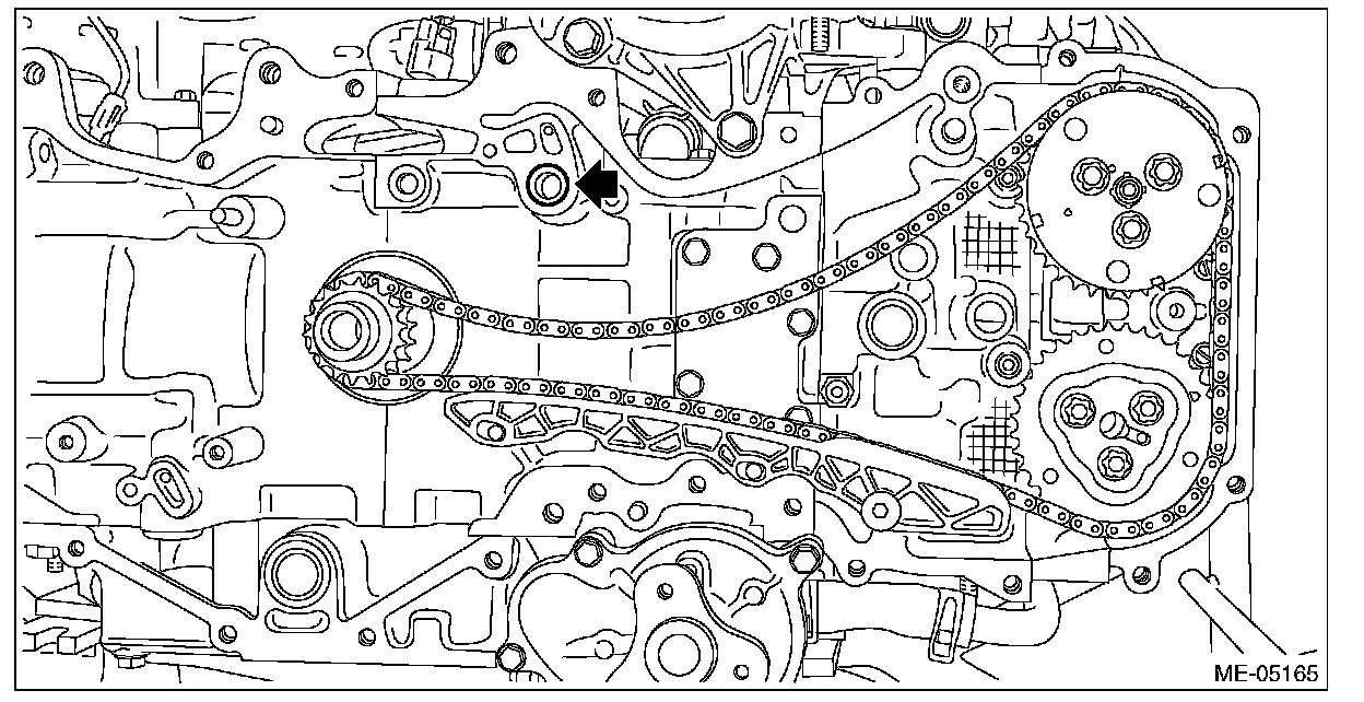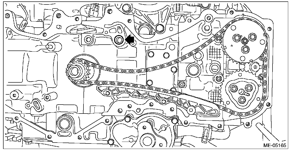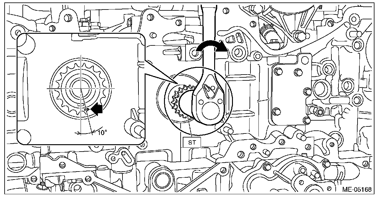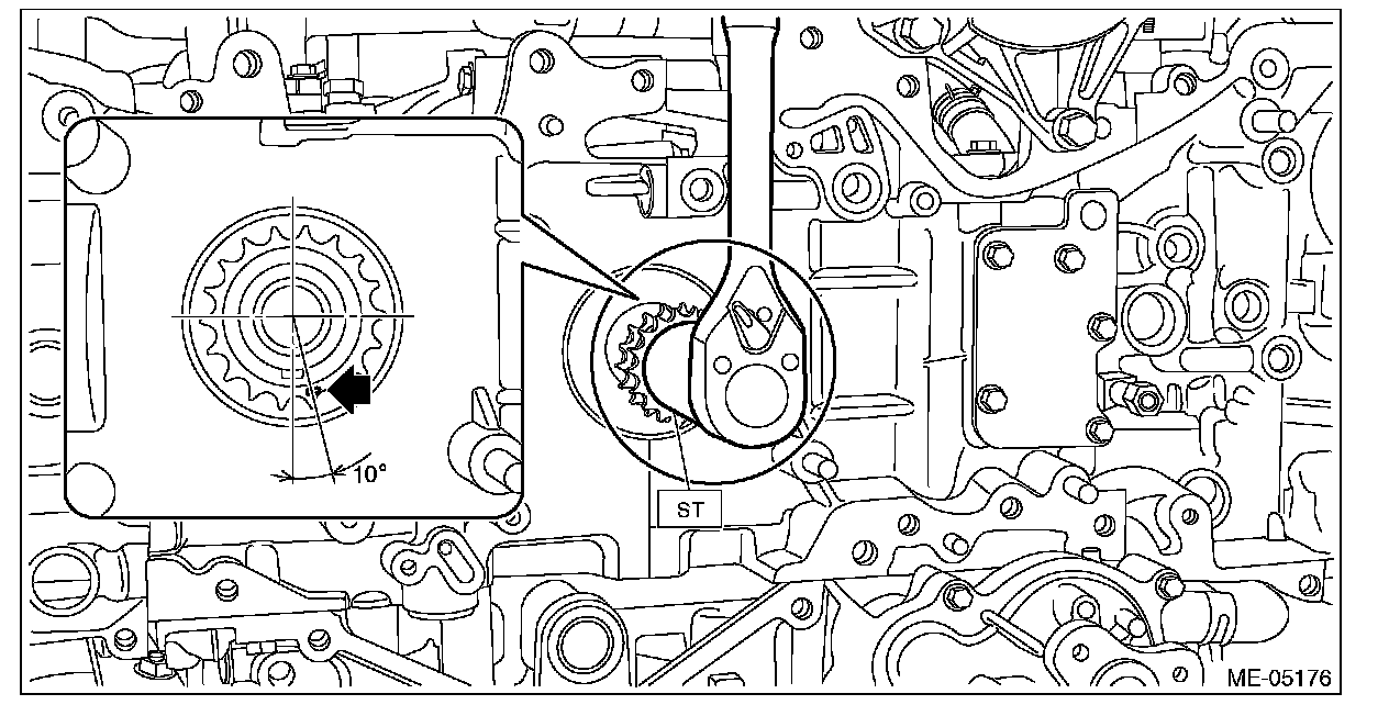 2) Check that the crank sprocket is located at the position sown in the figure. If not aligned, using ST turn the crankshaft to align the crank sprocket alignment mark to the position shown in the figure.