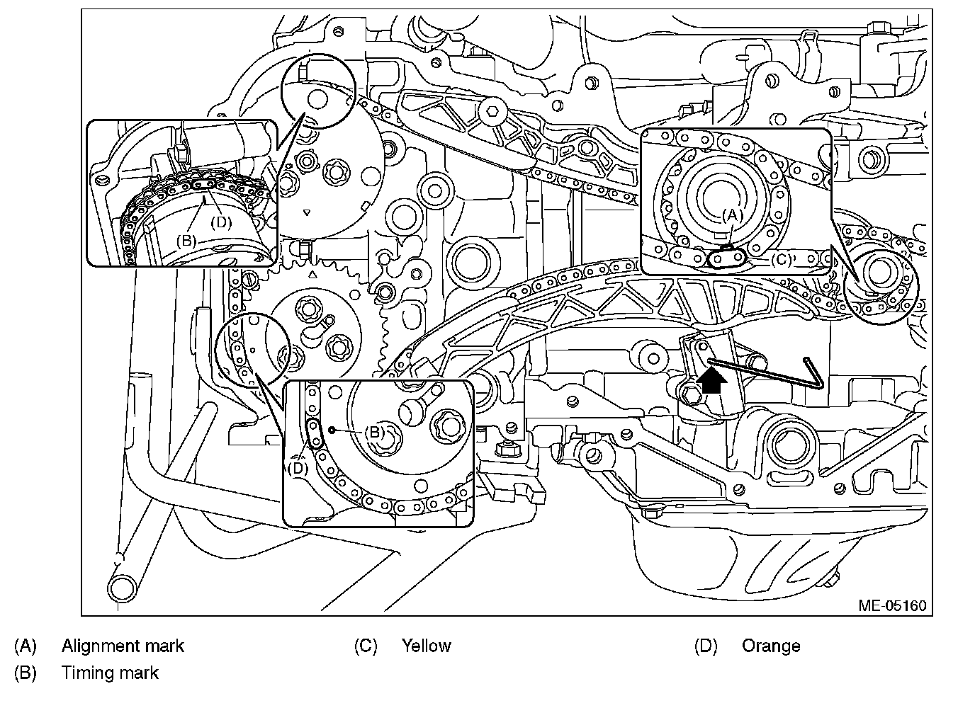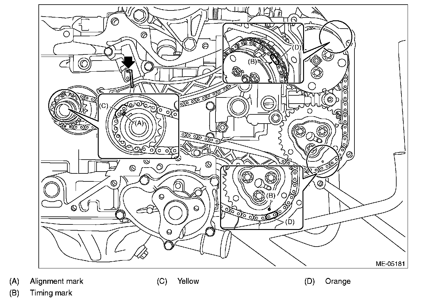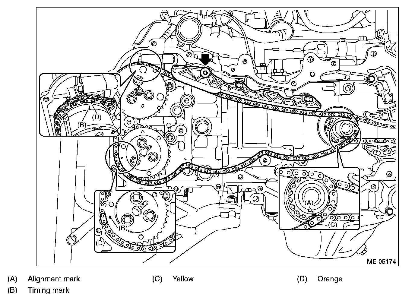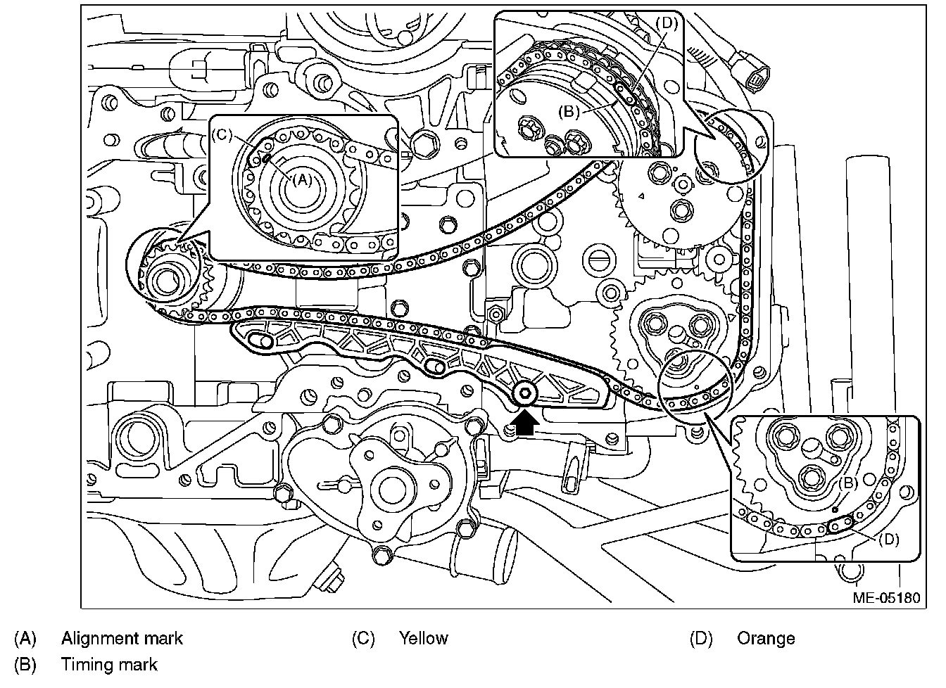 ^ Matching of the timing chain mark (orange) to the timing mark position of the intake cam sprocket LH.