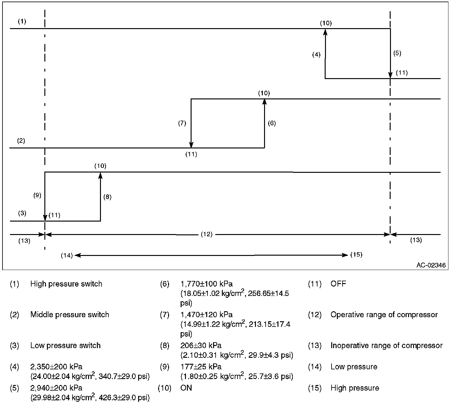 3. Start the air conditioner, and check the operating pressure of switch by turning the compressor (magnet clutch) to ON/OFF. Operation of each switch is as follows.