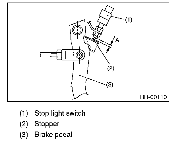 Loosen the lock nut, and adjust the stop light switch position until the clearance (A) between the threaded end of the stop light switch and stopper becomes 0.3 mm (0.012 in). Then, tighten the lock nut.
