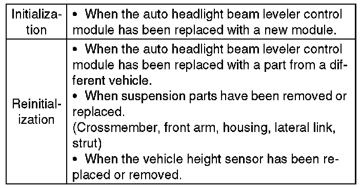 When parts related to the auto headlight beam leveler system are removed or replaced, perform the following procedures to initialize or reinitialize.