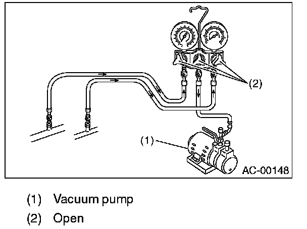 4. Operate the vacuum pump and open the low pressure and high pressure side valves. Next, open the center manifold hose valve, and begin evacuation.