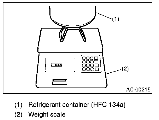 11. When a 13.6 kg (30 lb) refrigerant container is used, measure the amount of refrigerant with a refrigerant charging scale, and connect with the center manifold hose.