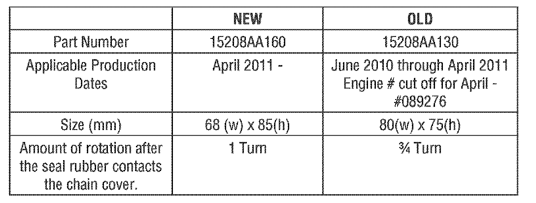 Please be advised that there has been a running design change on the engine oil filter used for the 2011 Foresters with naturally aspirated (FB25) engines.