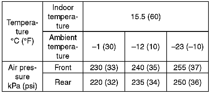 - When adjusting tire pressure indoors in winter, there is a big temperature difference between the indoor facilities and outside. Once the car is outside where the temperature is lower, the air pressure in the tires will drop, causing the tire pressure warning light to illuminate, even if the pressure in the tires was adjusted to standard values indoors. To avoid this, it is necessary to adjust the tire pressure to the high side in consideration of the difference in temperature between inside and outside according to the following table.