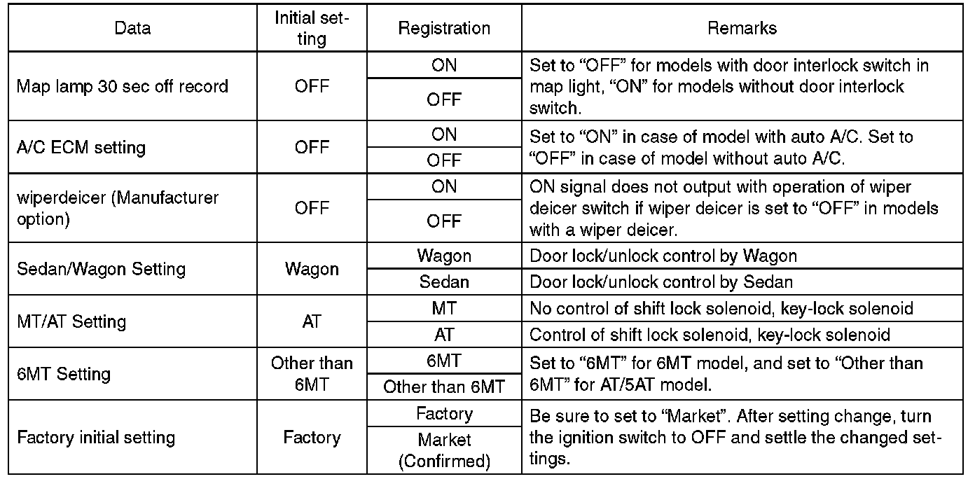 CAUTION: Body integrated unit is core of LAN system, and also can select the function of all vehicle system control. It is possible to control the original functions of vehicle when registrations of body integrated unit and function setting are corresponded to vehicle equipment. If registrations and function setting are different from vehicle equipment, vehicle system does not operate normally and diagnosis cannot be performed correctly. Pay attention to following item.