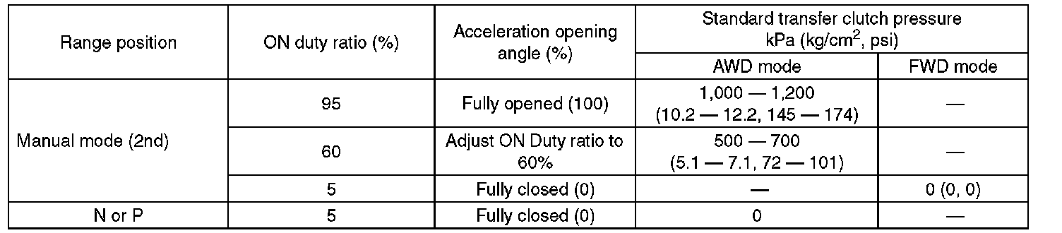 Check the transfer clutch pressure in accordance with the following chart in the same manner as for line pressure. Line Pressure Test