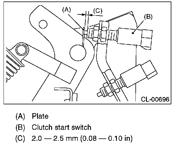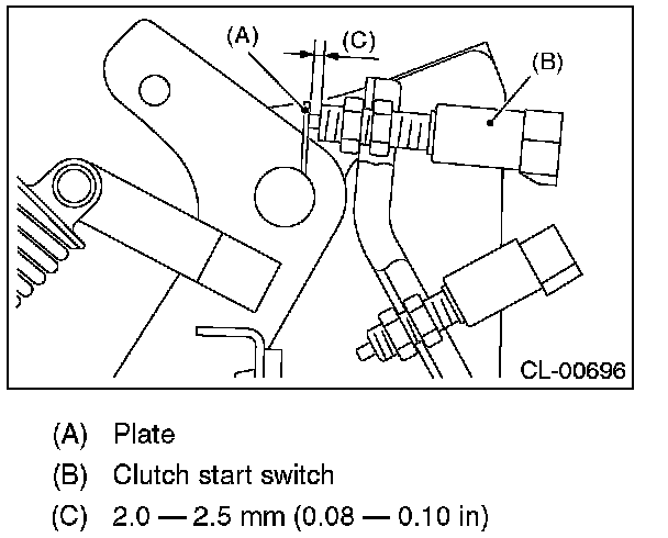 3) Adjust the gap of the clutch pedal plate and the clutch start switch to be 2.0 - 2.5 mm (0.08 - 0.10 in).