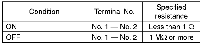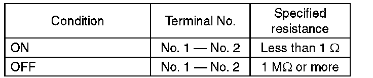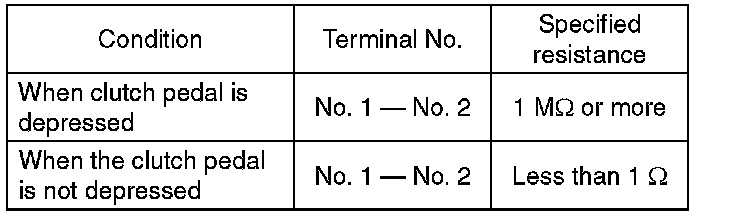 (2) Measure the resistance between terminal 1 and 2 of the switch. If the resistance is not within the specification, check the clutch stroke and installation condition, and check the clutch switch again.