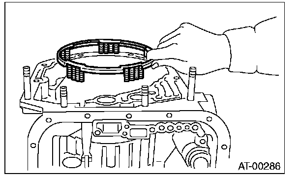 14) Installation of the low & reverse brake: Install the dish plate, driven plate, drive plate and retaining plate, and then secure them with a snap ring.