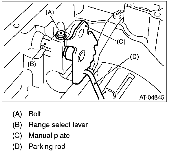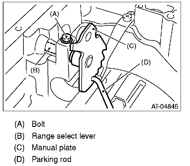 12) Remove the bolts securing select lever, and then remove the select lever, manual plate and parking rod.