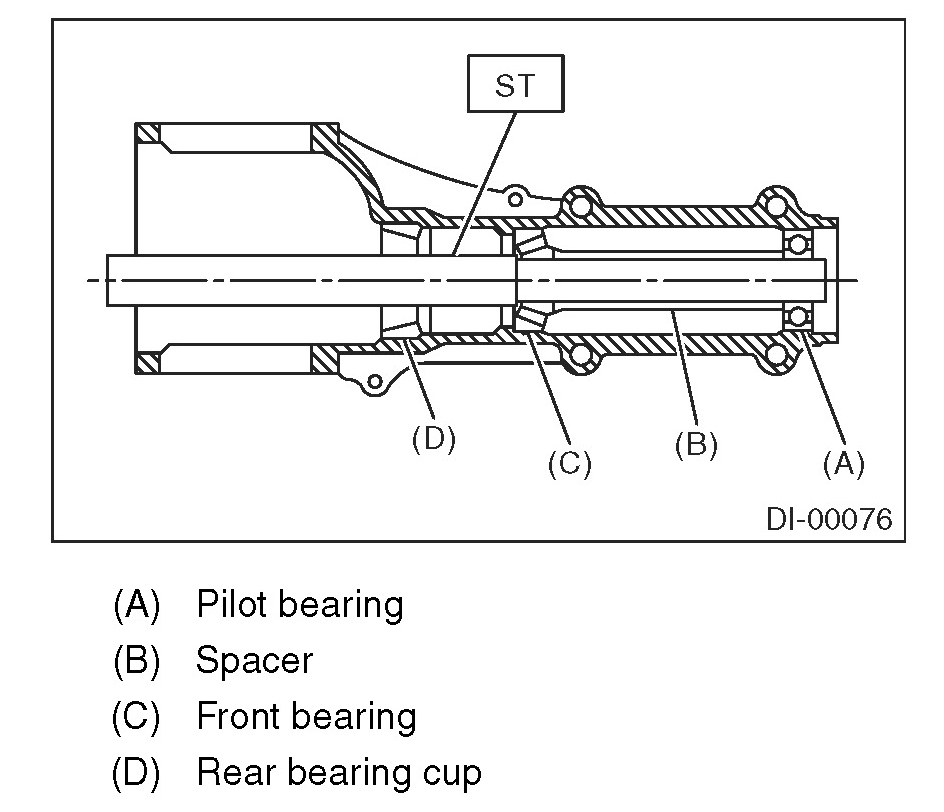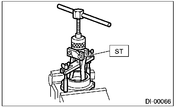 18) Remove the pilot bearing together with the front bearing cone and spacer using the ST.