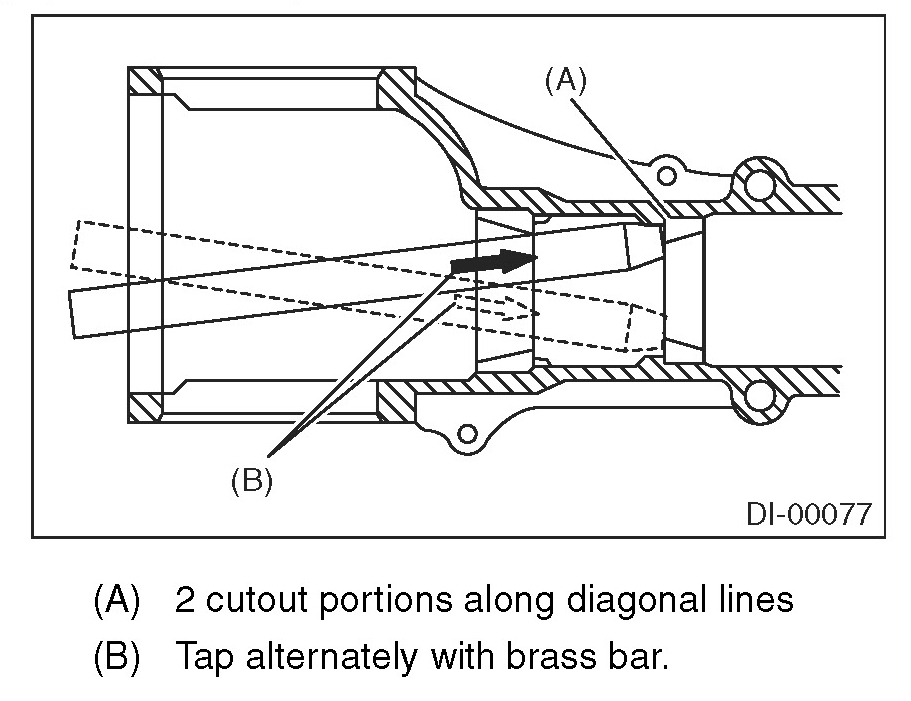 19) When replacing the bearings, use a brass bar to tap out the front bearing cup and rear bearing cup (in this order).