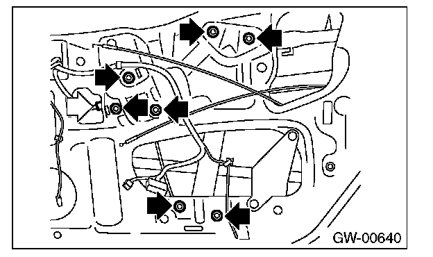 3. Remove the bolts, and then remove the front regulator and motor assembly.