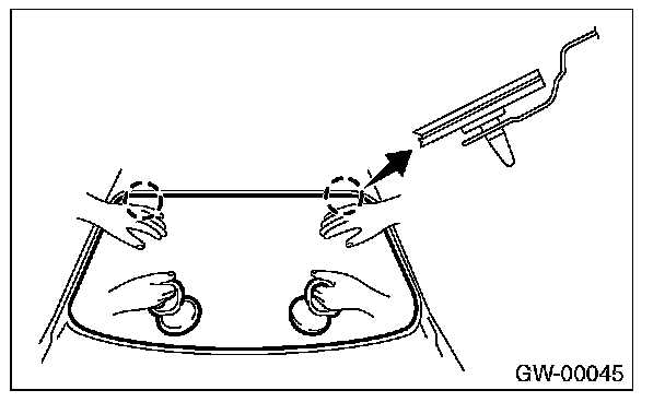 10. Using suction rubber cups, fit the locator pins into the body side, and attach the windshield glass.