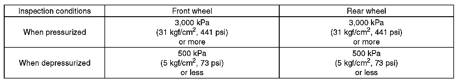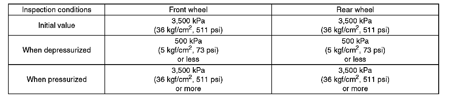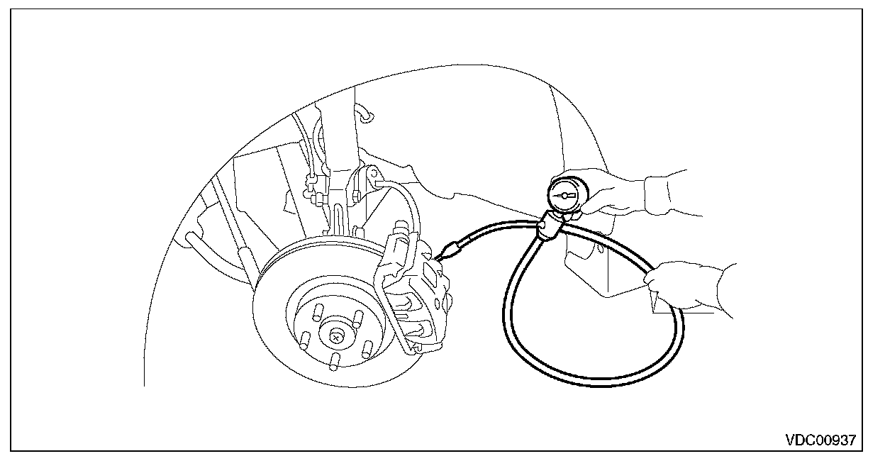13) Read the values indicated on the pressure gauges and check if it is within specification. Depress the brake pedal and check that it is not abnormally hard, and tightness is normal.
