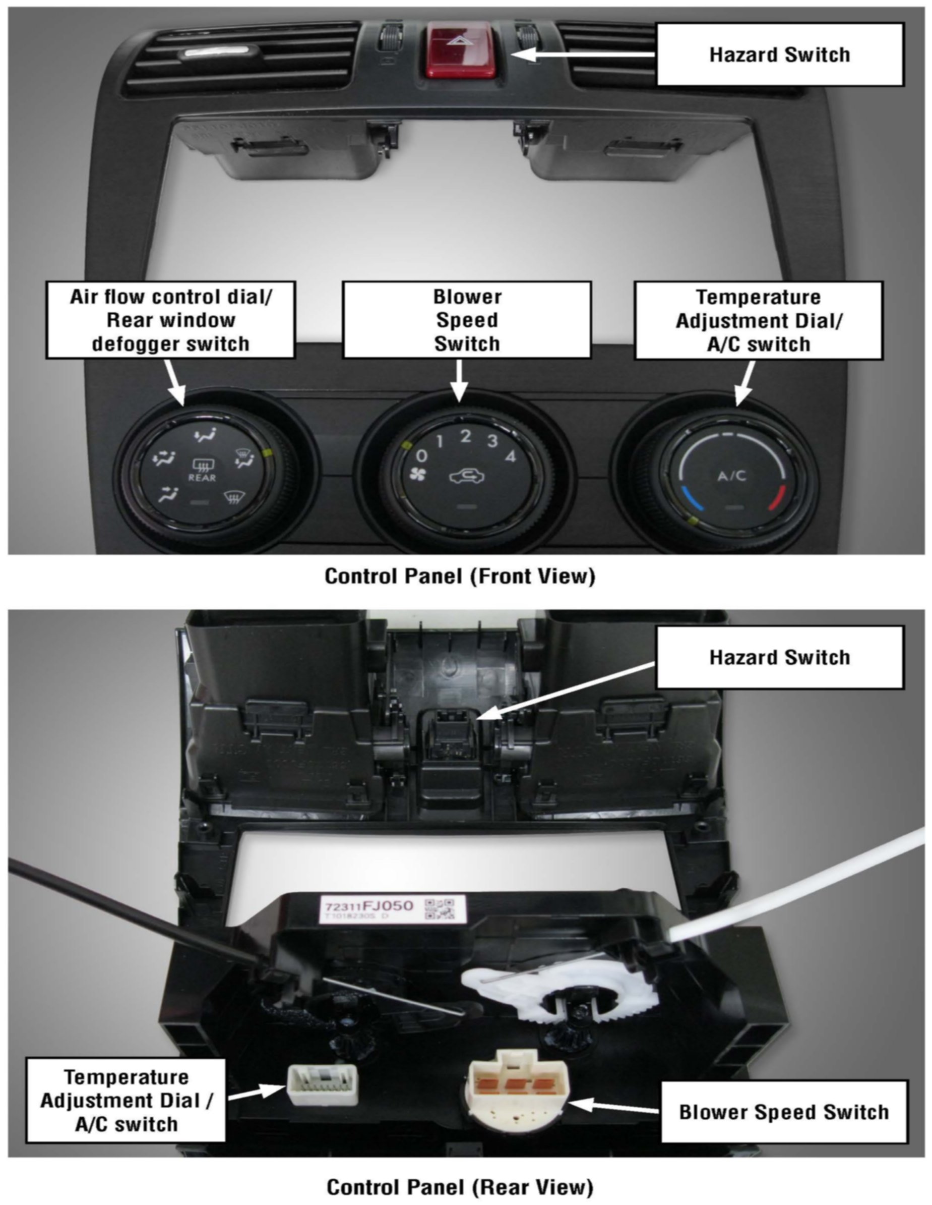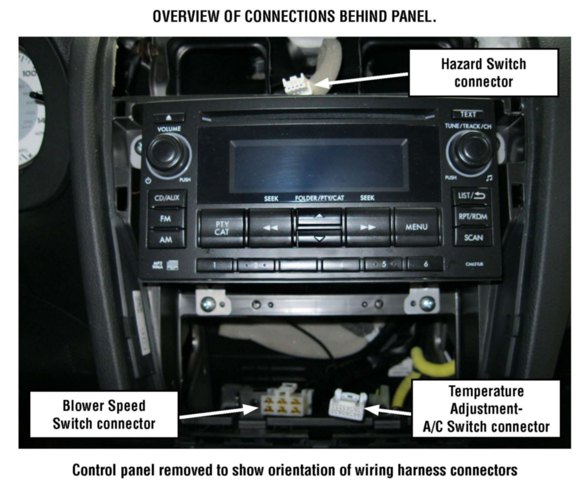 The following information will provide an overview of the connections behind the center panel assembly combined with important cautions for the removal of this panel. These precautions are in addition to the information listed in the Subaru Service Manual for removing the center panel / heater control assembly.
