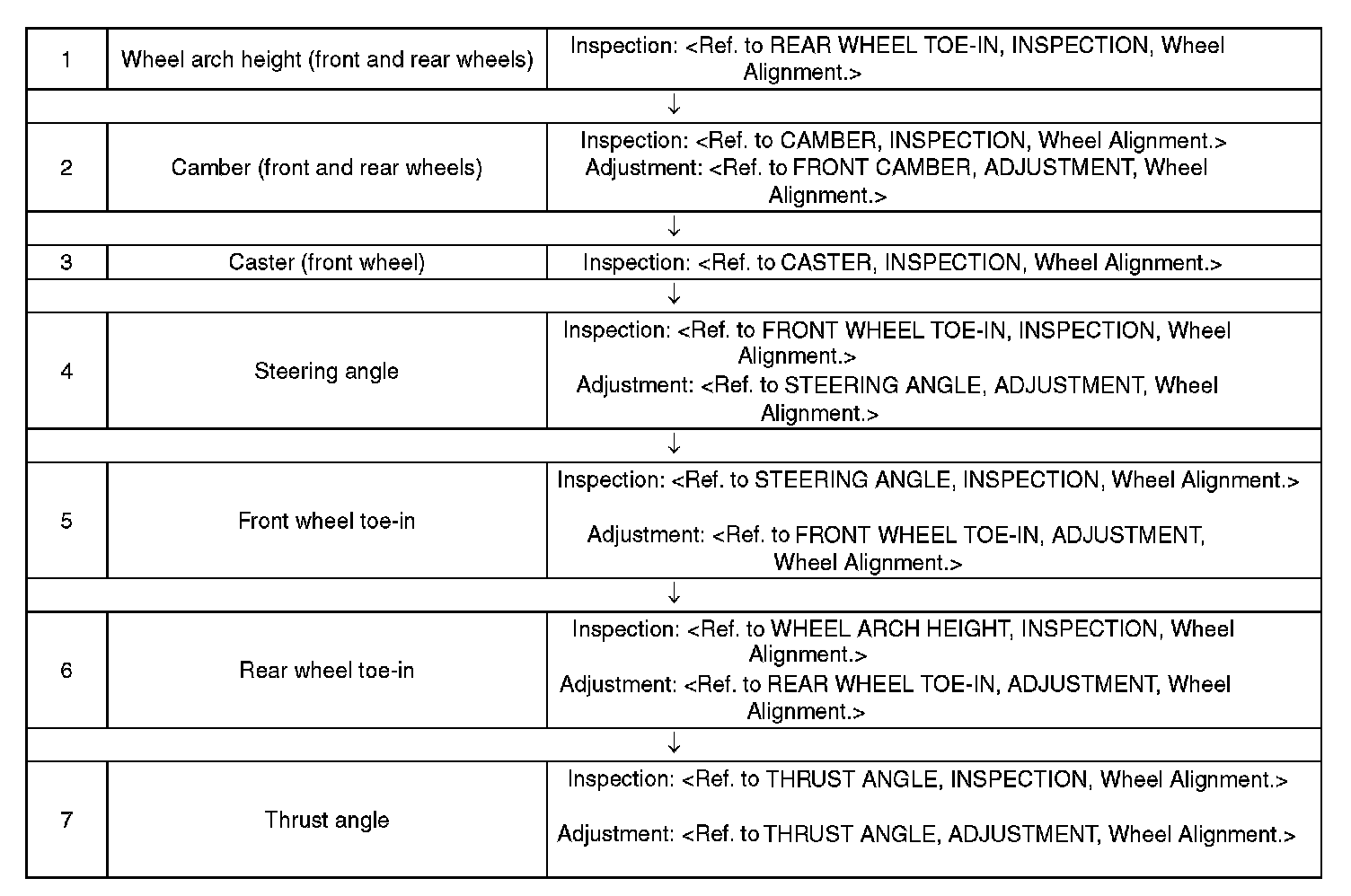Check, adjust and measure the wheel alignment in accordance with the following procedures.