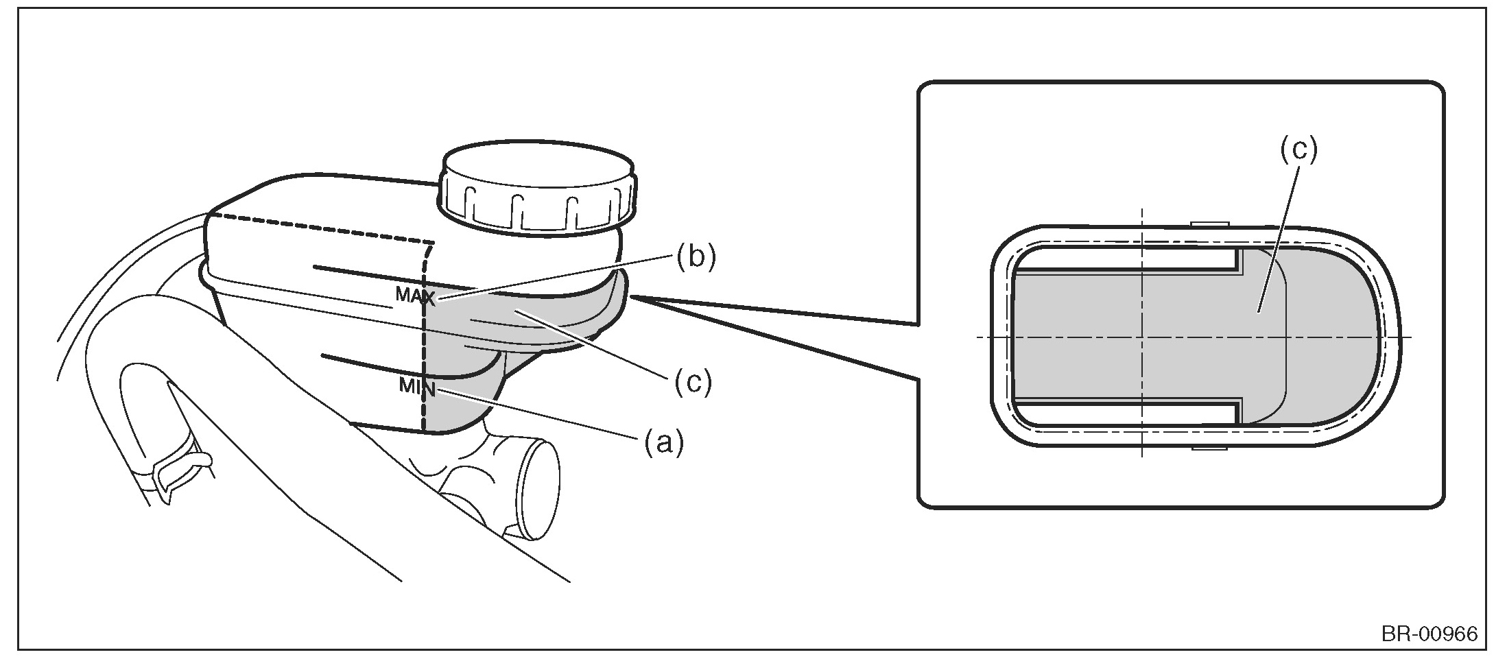If out of the specified range, refill with brake fluid (c) or drain it.