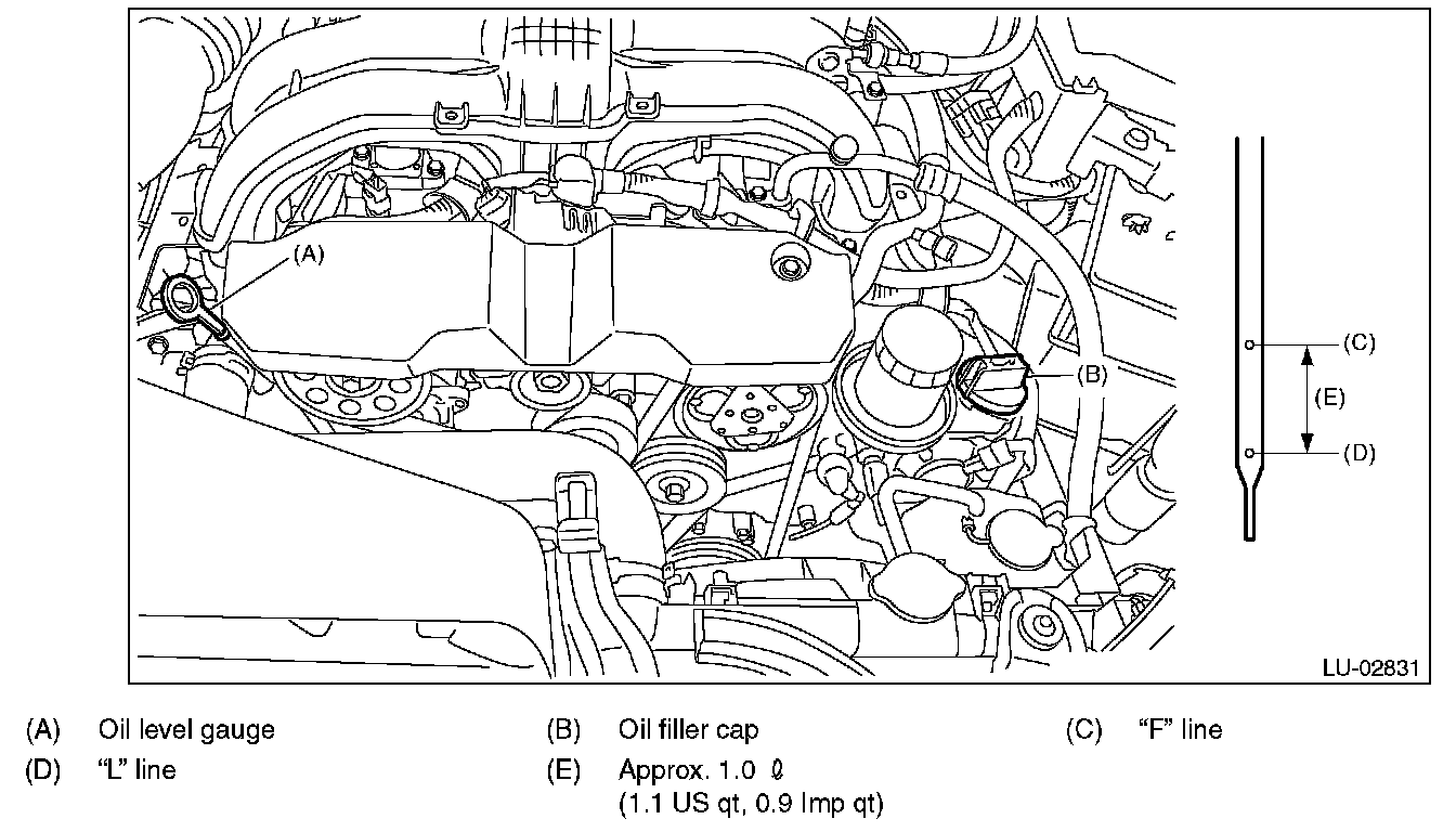 6) Select engine oil of adequate quality and viscosity and fill it through the oil filler duct to the "F" line on the oil level gauge. Make sure that the vehicle is parked on a level surface when checking oil level.