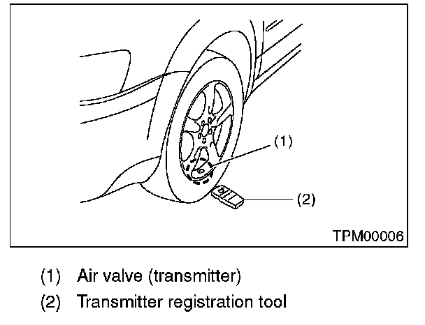 7) Contact the transmitter registration tool to the side wall area near the air valve on the front left tire, and press the switch. The transmitter ID is sent to the TPMS & keyless entry control module. (At that time, the tire pressure warning light blinks to confirm that the registration has started.)